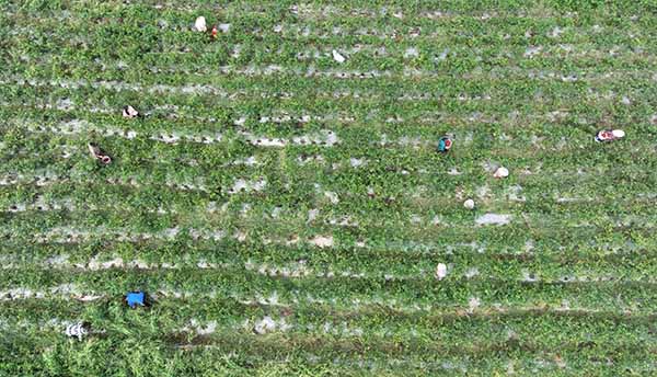 村民采摘辣椒,按照“七角一斤”称重,多做多得,村民们趁着早上天气凉爽,早早到地里采摘辣椒。