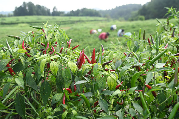 8月6日,村民在松桃苗族自治县黄板镇前丰村采摘辣椒。