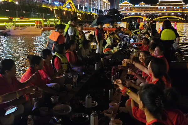 三都县依托“贵州村马”IP,加持文旅新业态,在世界最长木龙舟上开设了兼具水族特色的长桌宴,让游客在都柳江上沉浸式品尝三都特色美食,观赏都柳江美丽夜景。都柳江边,音乐会表演精彩纷呈,民族歌手献唱,变脸、变魔术等节目将现场热闹的氛围达到最高点,让游客们感受到三都不一样的文化魅力。