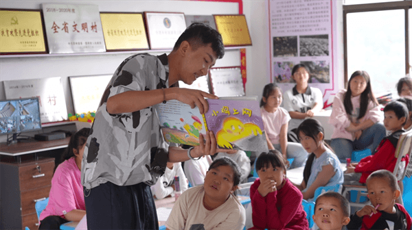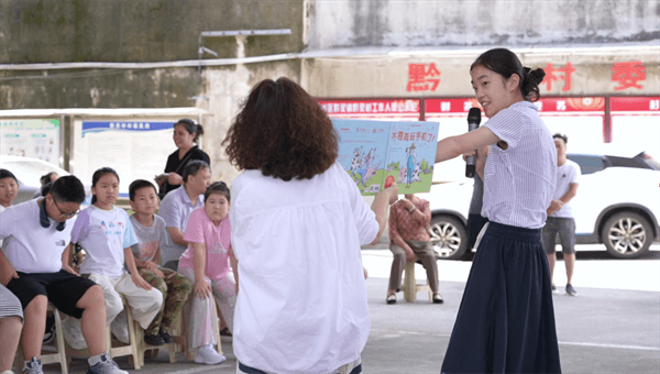 系列活动通过丰富的环节,让阅读陪伴成为暑期最动人的风景。在“触摸文脉”环节中,孩子们跟随主持人和阅读志愿者一起,翻开《贵阳史话》探索家乡的悠久历史和独特文化,书页里的故事仿佛活了过来,激发他们对本土文化的认同感;在“童声代言”活动中,小小读者们踊跃分享自己的家乡见闻,化身家乡的“小名片”,用稚嫩声音传递乡土情怀;在“故事护航”部分,生动有趣的绘本故事巧妙融入网络安全与生活常识教育,让孩子们在轻松氛围中学会自我保护;最后,“书香续航”的多元活动如手工创作、诗歌朗诵和亲子阅读会,持续点燃孩子们的求知热情,为他们的成长之路增添亮色,让农家书屋成为暑期最富童趣的乐园。