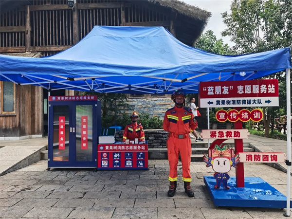 在黄果树景区,有这样一群特殊的 “守护者”——“蓝焰黔行”志愿服务队的志愿者们。他们日复一日地在景区开展志愿服务,用专业与热情为游客筑起一道安全防线,让游客在欣赏壮美山水的同时,更能感受到浓浓的暖意与安心。
