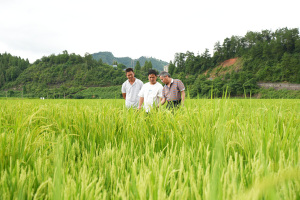 姚涛(中)与制种专家、种植户在查看制种水稻授粉情况。(吴国明 摄)