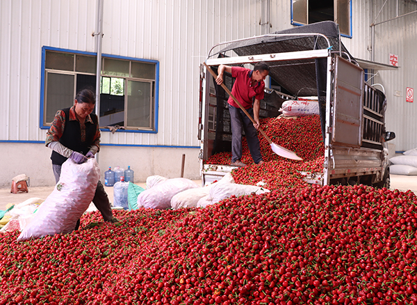 当辣椒迎来丰收季,当地加工厂也被这份喜悦“点燃”,变得热闹起来。在徐源辣椒有限公司的加工厂内,刚从田间运来的鲜辣椒被送上了自动化生产线,经过烘干,最终变成了一袋袋香气扑鼻的干辣椒。