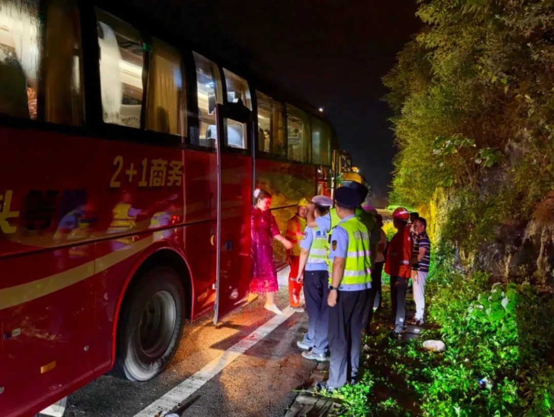 据了解,7月22日21时许,一辆桂M****8号旅游客运大巴车搭载35名老年游客行驶至仁望高速平正路段时,因离合器故障,车辆无法继续前行。当时正下着雨,车旁不停地有乘客在走动。遵义交警巡逻发现情况后,立即联合高速公路“一路多方”部门将车上乘客转运至安全地带。同时联系拖车先将故障车拖走,消除道路风险隐患。