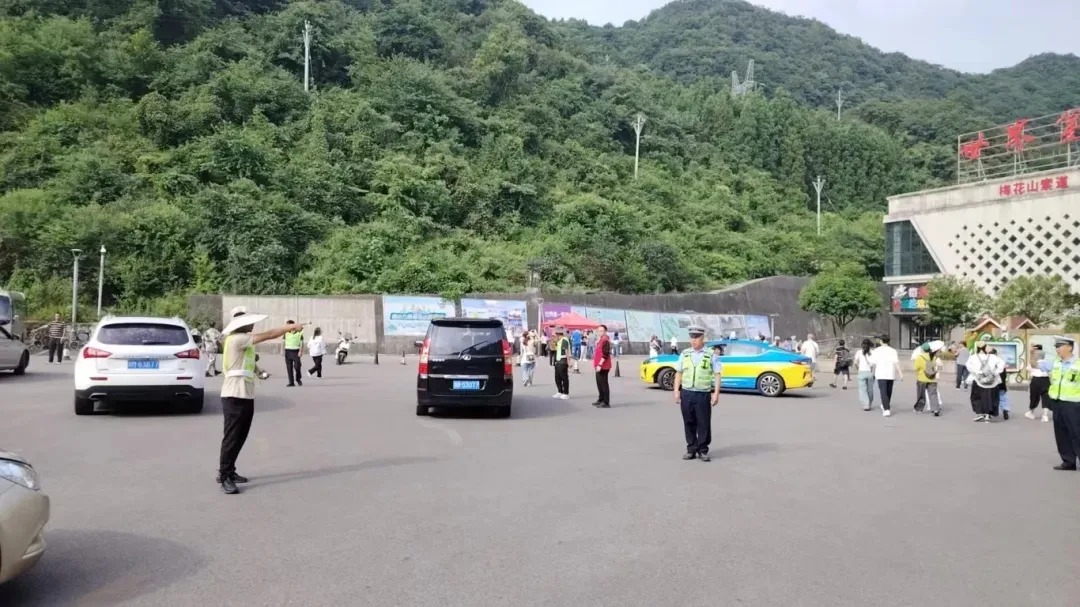 “请大家别急,按顺序停放,里面有人引导!”——施秉交警沙哑却坚定的声音,一遍遍安抚着焦急的游客。