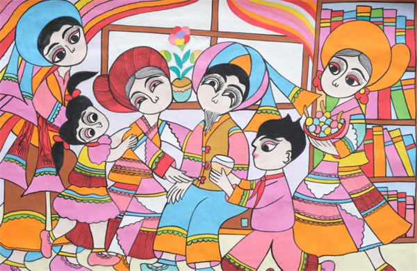 “我从小就跟着妈妈学挑花、刺绣、蜡染,为后来把针线活变成画作打下了坚实的基础!”熊师提的话语道出了水城农民画的起源密码。20世纪70年代,陡箐镇猴儿关的苗族妇女将刺绣、蜡染图案搬上画纸,以大胆的构图、浓烈的色彩勾勒生活图景。历经积累,画作于80年代逐渐走出大山,亮相国际舞台。1988年,水城区凭借独特的民间绘画艺术获评“中国现代民间绘画画乡”“中国民间文化艺术之乡”,猴儿关成为农民画的重要起源地。