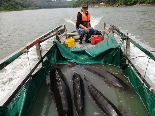 中国科学院水生生物研究所团队在赤水河水域投放长江鲟亲鱼。