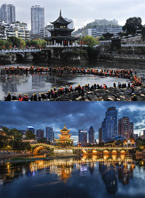 图为2012年贵阳市南明河甲秀楼段综合整治现场与如今整治后的场景对比。(上图 文春 摄,下图 杨良强 摄)