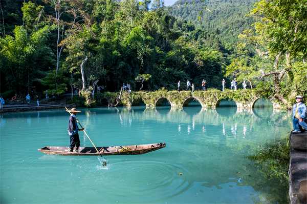 图为黔南州荔波县小七孔景区游人如织,护河员打捞水中杂物。杨良强 摄