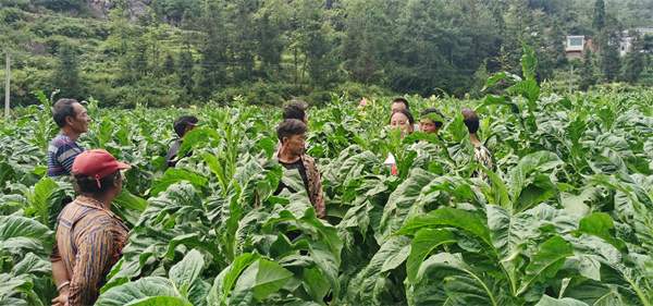 傍晚时分,施柱富家的院子里热闹非凡。妻子李艳正忙着招呼前来“取经”的乡亲们,村主任、烟站技术员带着几位返乡青年和寨里烟农,围坐在院中交流种烟经验。