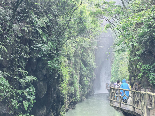 “锅圈岩瀑布宽40米,这是景区的核心奇观,步道穿梭于峡谷与瀑布旁,沿途游客可以观赏神秘的钟乳石,景区还在完善休憩长椅和瀑布咖啡,7月21日以来,每日游客量超过两千人次。”奢渡河峡谷景区讲解员柴璐介绍。