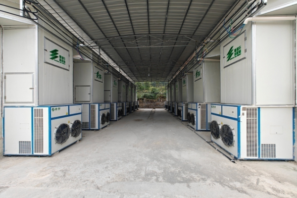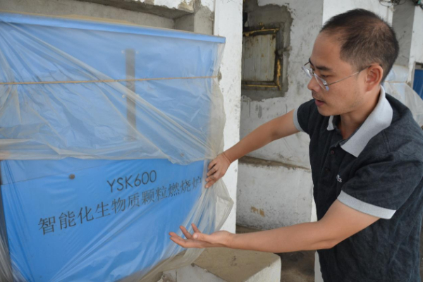 工作人员检查绿色生物质烤房设备。
