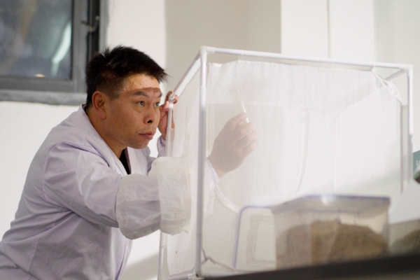 技术人员查看麦蛾茧蜂生长情况。