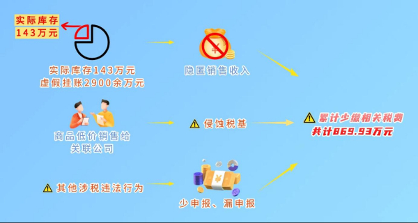 除以上违法事实外,该公司还被查实存在少计企业所得税收入、违规列支预提费用、少申报房产税等其他涉税违法行为,累计少缴增值税、消费税、房产税、企业所得税等相关税费共计869.93万元。