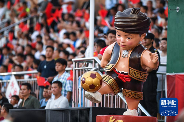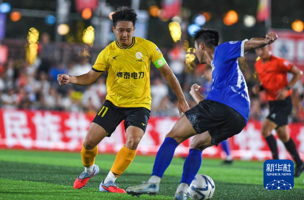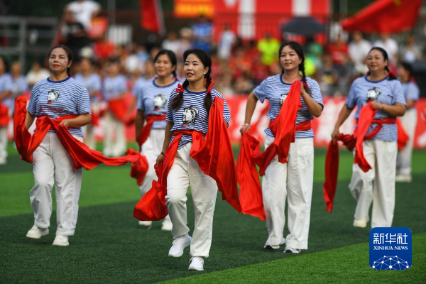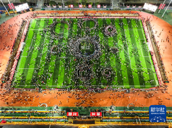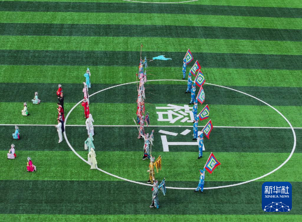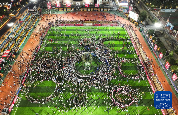 8月23日,演员在首届“村超”全国赛总决赛中场时间表演节目。新华社记者 杨文斌