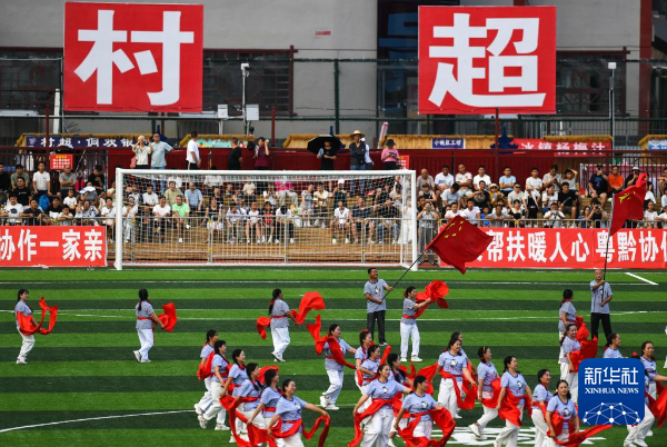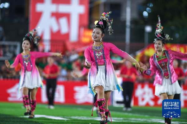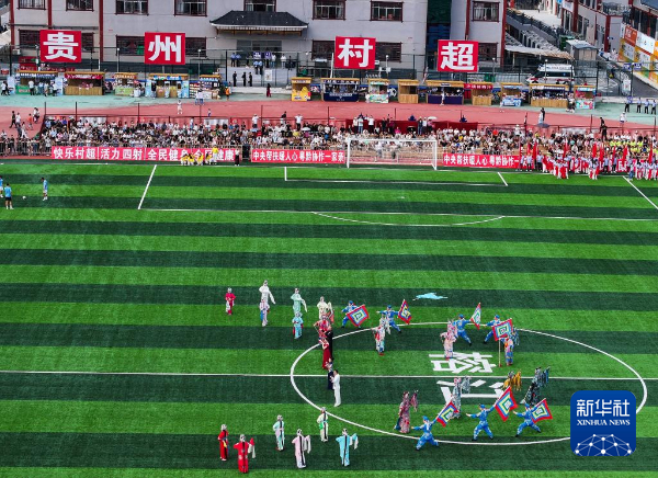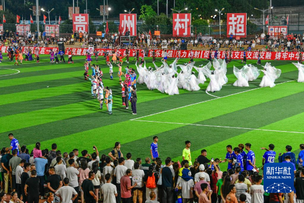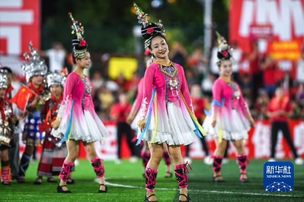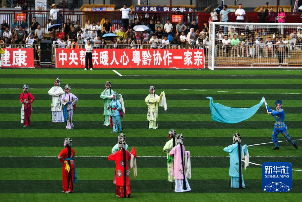 8月23日,演员在首届“村超”全国赛总决赛中场时间表演节目。新华社记者 杨文斌 摄