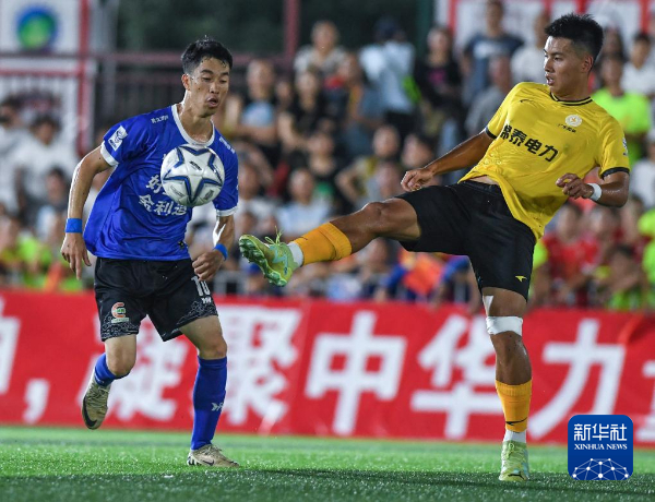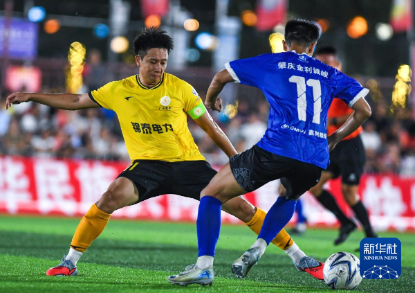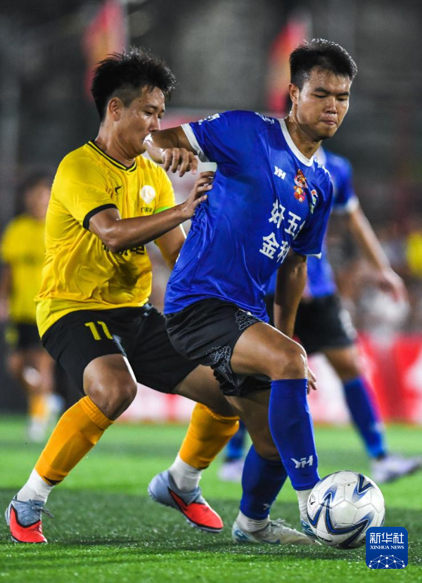 8月23日,广东和平商会足球队球员陈宇(左)与广东肇庆金利诚峻足球队球员陈开乐在比赛中。新华社记者 杨文斌 摄