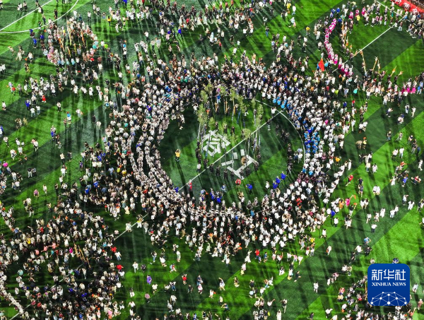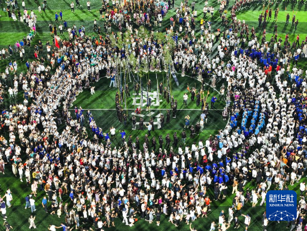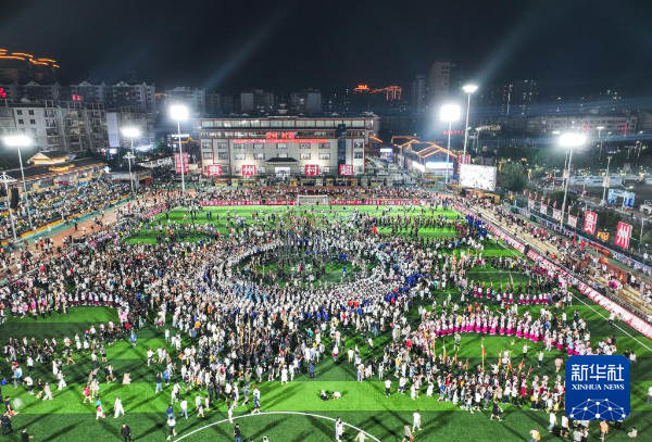 8月23日,人们在贵州“村超”球场跳苗族芦笙舞(无人机照片)。新华社记者 杨文斌 摄