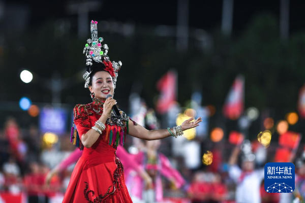 8月23日,民族歌手在首届“村超”全国赛总决赛中场时间演唱歌曲。新华社记者 杨文斌 摄