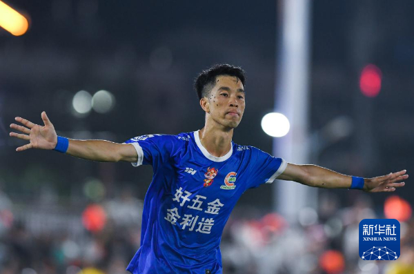 8月23日,广东肇庆金利诚峻足球队球员陈友智在比赛中庆祝进球。新华社记者 杨文斌 摄