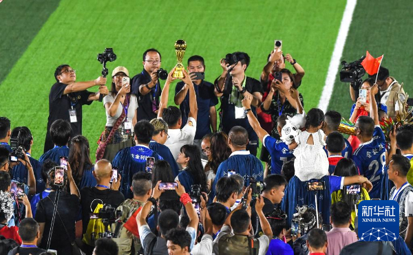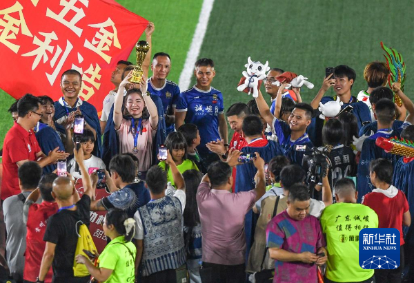 8月23日,广东肇庆金利诚峻足球队庆祝夺冠。新华社记者 杨文斌 摄