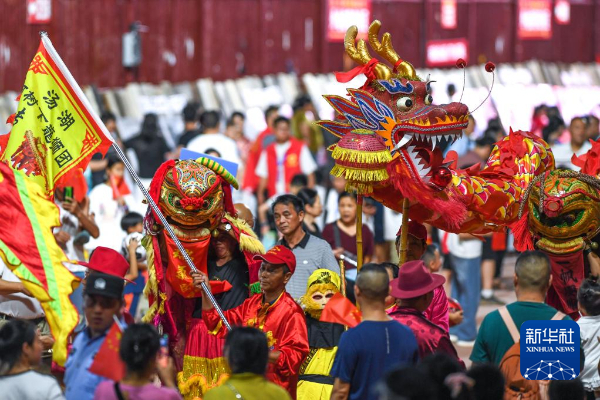 8月23日,拉拉队在贵州“村超”球场舞龙。新华社记者 杨文斌 摄