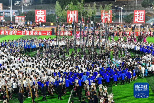 8月23日,人们在贵州“村超”球场跳苗族芦笙舞。新华社记者 杨文斌 摄