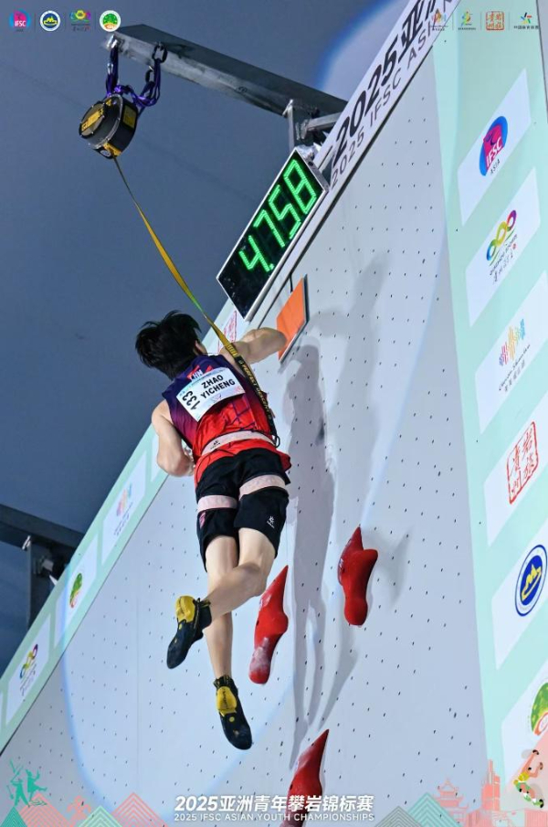 此次亚青赛,赵一程感觉很兴奋,甚至有些“太兴奋了”。23日赛前,他从还在酒店时就开始热身,“是热身做得最充分的一次”。上墙前,他觉得全身都“得到了很好的激活”。第一趟十六进八的攀爬,他的出发反应时仅为0.103秒——再快千分之四秒,他甚至就会被判抢跑。