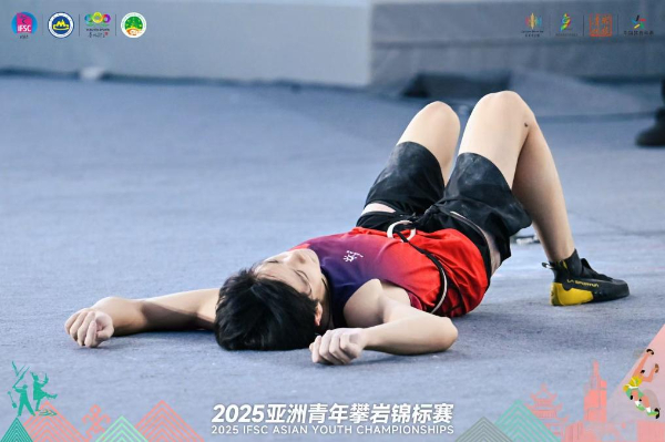 今年第一次输掉比赛的男孩从空中降下。他不忘带着笑意先与对手握手,但之后又走回自己的赛道下,背对观众蹲下。转播大屏的特写镜头捕捉到了他脸上再也掩饰不了的失落和悔意。随后,他躺倒在了岩壁下,眼睛盯着15米之上的终点……