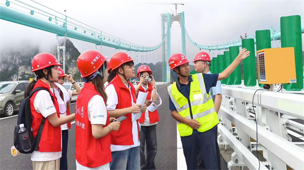 8月20日上午,实践团队严格按照六安高速八标段路面作业的安全防护要求,进入花江峡谷大桥施工现场开展思政课实践教学。贵州桥梁集团第三分公司总工程师吴朝明和贵州顺康检测股份有限公司桥隧事业部技术负责人雷民先后为队员们讲解花江峡谷大桥的施工建设和荷载试验情况。据吴朝明介绍,这座高625米、长2893米的世界第一高桥迄今已经申请到17项专利。大桥开工时参与建设团队平均年龄只有28岁,工程已经持续近5年,建设团队始终坚持在建设一线,用“舍小家为大家”的工匠精神支撑着工程突破、冲刺着工程奇迹。雷民详细讲解了即将进行的荷载试验技术标准与方案。两人均认为,大桥通车不仅可带动当地经济的快速发展,而且大桥建设自身的科研意义与学术价值也极为深远,积累的建设经验和创新技术也将为国内外大桥建设项目提供重要借鉴。