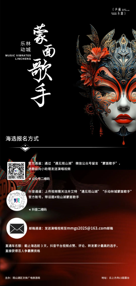 关注“遇见观山湖”公众号→后台留言“蒙面歌手”获取进群二维码→加群后向小助理发演唱视频;或发送姓名 + 联系方式 + 演唱视频至邮箱mmgs2025@163.com。