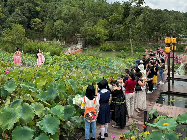 今年暑期,问仙谷的荷花盛放引来众多摄影师。为提升观赏与拍照体验,景区特别打造沉浸式场景,免费开放烟雾弹、主题道具等,让市民游客尽兴而归。
