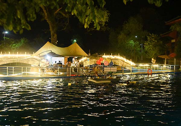 乌罗镇桃花源景区改造的泳池已投入使用,游客在“夜泳”。