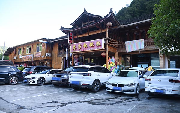 松桃苗族自治县乌罗镇桃花源景区民宿门口停满了游客的车辆。