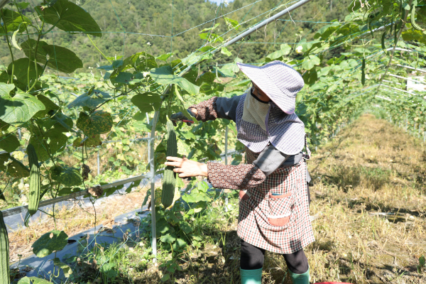 村民正在采摘丝瓜。