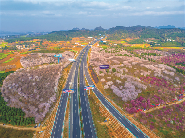“三季有花,四季常青”沪昆高速公路红枫湖段沿途樱花盛开。(贵州省交通运输厅 供图)