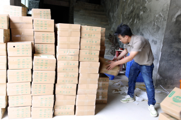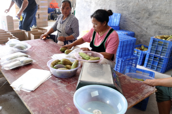 饱满的热情伴着果子的清香,让路过的人都忍不住想上前尝一口。与此同时,基地田垄间,几位村民正小心翼翼采摘着成熟的八月瓜,她们的篮子很快便被装满;而在不远处的仓库里,另一批村民已准备好打包材料,按照 “早上采摘、下午发货” 的节奏,将新鲜果子分装、贴单,确保当天的订单能及时发往全国各地。
