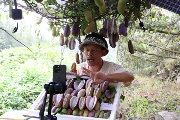 金秋九月,记者来到黄果树旅游区龙宫镇木厦河村的八月瓜种植基地,刚踏入种植园区,便被山谷间回荡的直播声吸引,一位主播正对着手机屏幕激情澎湃地介绍八月瓜:“家人们看,我们的八月瓜自然熟透了,炸开了口,果肉软糯香甜……”另一位年轻主播化身“后台小妹”正在旁边回复直播间评论,并配合着主播热情地向全国网友推介着这款当地的“小众宝藏”水果。