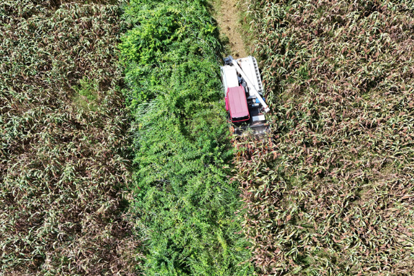 在天马镇雷公田村毛城坡高粱种植基地,两台收割机正在田间来回穿梭。驶过之处,挺拔的高粱秆连同饱满的穗头被“吞入腹中”,摘穗、脱粒、除尘、秸秆粉碎还田一气呵成。红彤彤的籽粒顺着传送带倾泻而下,迅速装入运输车辆。