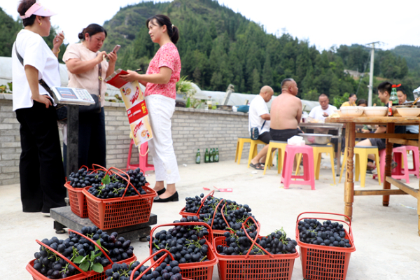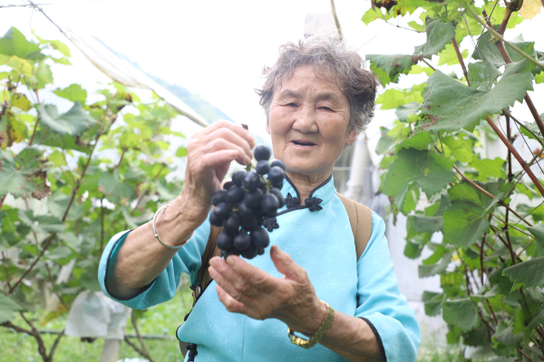 “我种植的5亩葡萄,在田间管理方面突破了很多难题,当地政府也常常派农技干部来指导防病害、施肥、剪枝、疏果、套袋等技术。我这个面积小,好管理,今年风调雨顺,产量好,只卖5元一斤,采摘可持续到9月底。今天,都是老顾客和周边游客来采摘,所以,家里有好吃的,我都拿出来招待。销售方面也在网上也卖一些,一年毛收入在15万元左右。”袁正祥说。