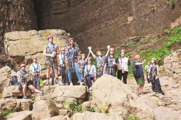 国际友人体验双河洞探洞。