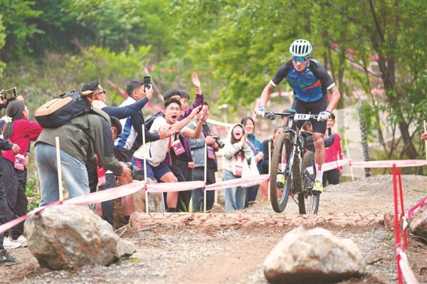 2025亚洲山地自行车锦标赛现场,观众在赛道旁为选手加油。(赛事组委会供图)