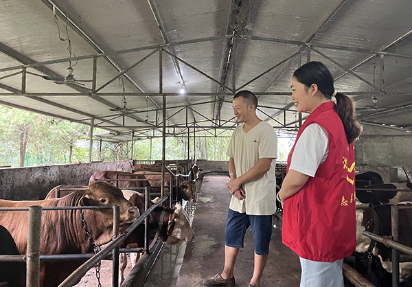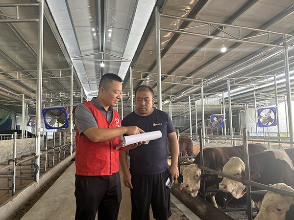 在白云乡白云村的俊玲养殖场,工作人员了解肉牛养殖情况。(王亚 摄)