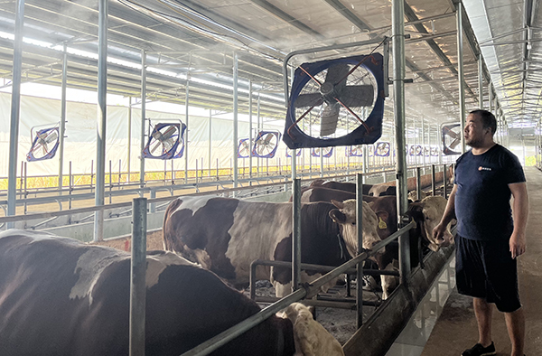 坐落在白云乡白云村的俊玲养殖场,同样呈现一派生机勃勃的景象。现代化牛棚内,自动风扇、喷雾降温和饲料拌匀机等设备一应俱全,50头西门塔尔牛在适宜环境中健康成长。“温度超过30℃时,降温系统会自动启动;拌料也不用人工,机器一键就能搞定,既省力又高效。”养殖场负责人高强介绍。