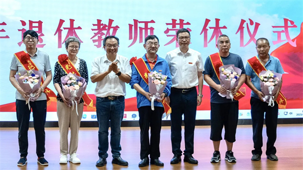 退休教师荣休仪式环节,肖建宗、潘良明为退休教师佩戴绶带,感谢他们对学校高质量发展的无私奉献。