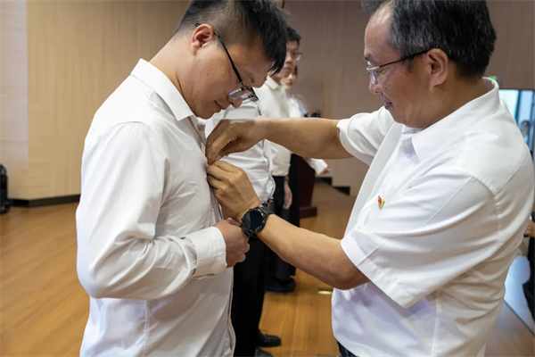 宣誓仪式后,潘良明为新进教师代表佩戴校徽,一枚枚校徽不仅是身份的象征,更是责任与传承的寄托。