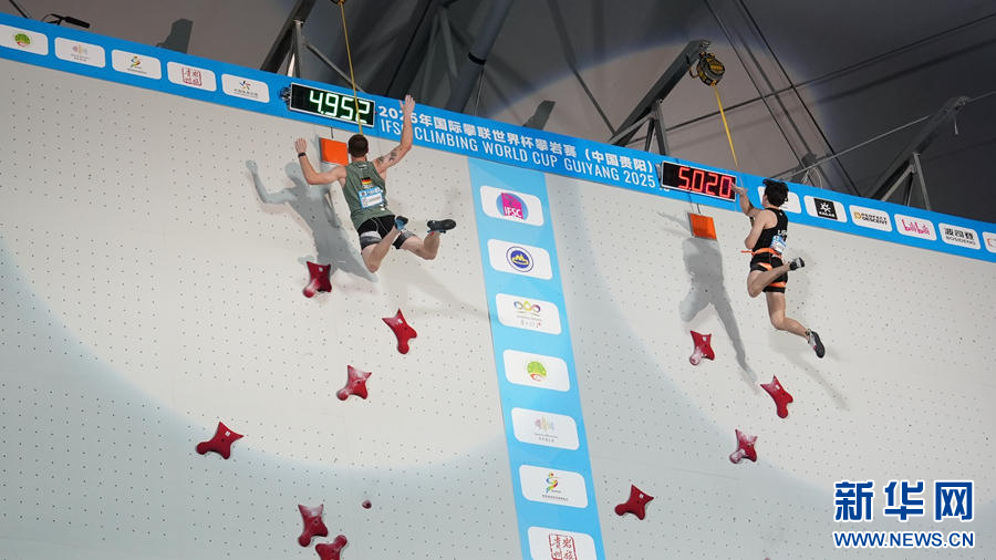 新华网贵阳9月14日电(周远钢)9月12日至13日,2025年国际攀联世界杯攀岩赛(中国贵阳)在贵阳市观山湖区贵州·彩湖国际攀岩中心举行,中国队选手储守宏、蒙世雪包揽男子、女子组冠军。本站比赛是攀岩世界杯速度赛首次落户贵阳,吸引了14个国家和地区的近70名攀岩高手同场竞技。赛事期间,贵州体育服饰品牌“黔超”精彩亮相,这是贵州省属国企体育品牌首次走向世界级赛事。