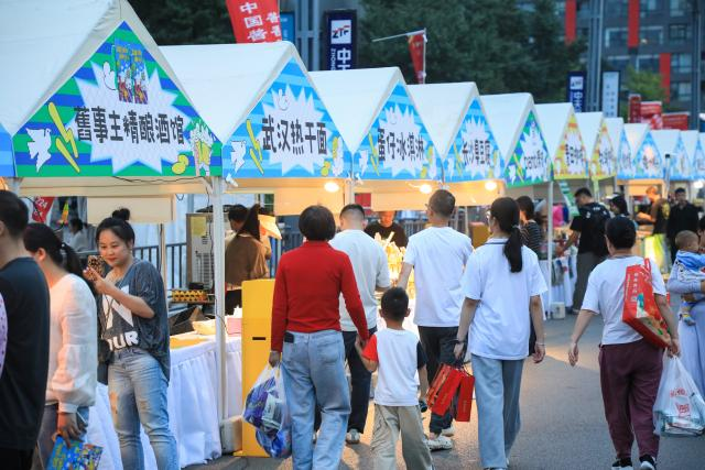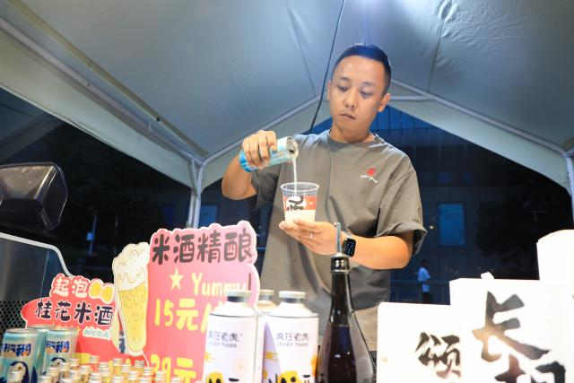 张發發新中式米酒店带来的本土特色精酿米酒吸引不少市民游客驻足品尝。“在马路边摆摊,能和顾客边聊天边分享精酿,这种氛围特别好,既传递了本土精酿的创意,也让更多人了解我们的品牌。”该店店长刘儒说。