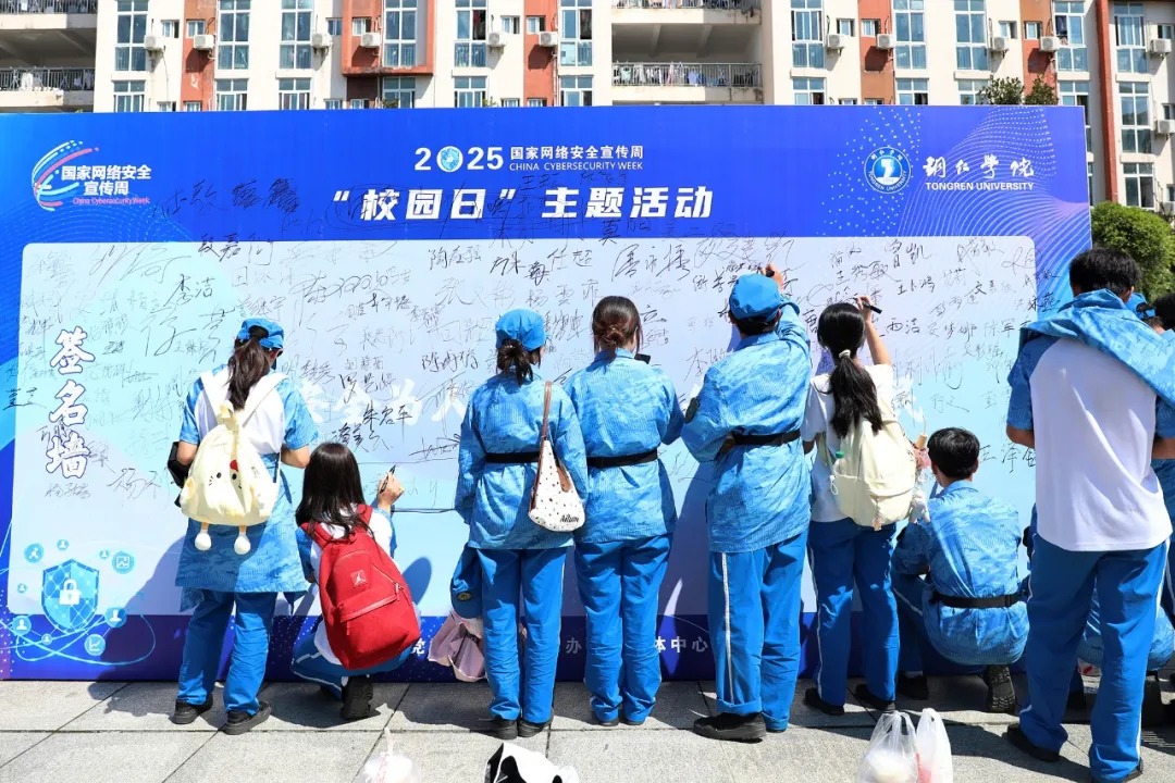 在活动现场,铜仁市公安局碧江分局工作人员和青年学生志愿者向过往师生发放了《中华人民共和国网络安全法》、网络安全宣传手册、防诈反诈宣传单等资料,参与活动的师生纷纷在主题签名墙上签名并合影留念。本次活动,有效提升了师生的网络安全意识,为构建安全、健康、文明的校园网络环境奠定了坚实基础。