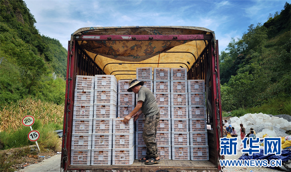 当地果农将猕猴桃装车。新华网 卢志佳 摄